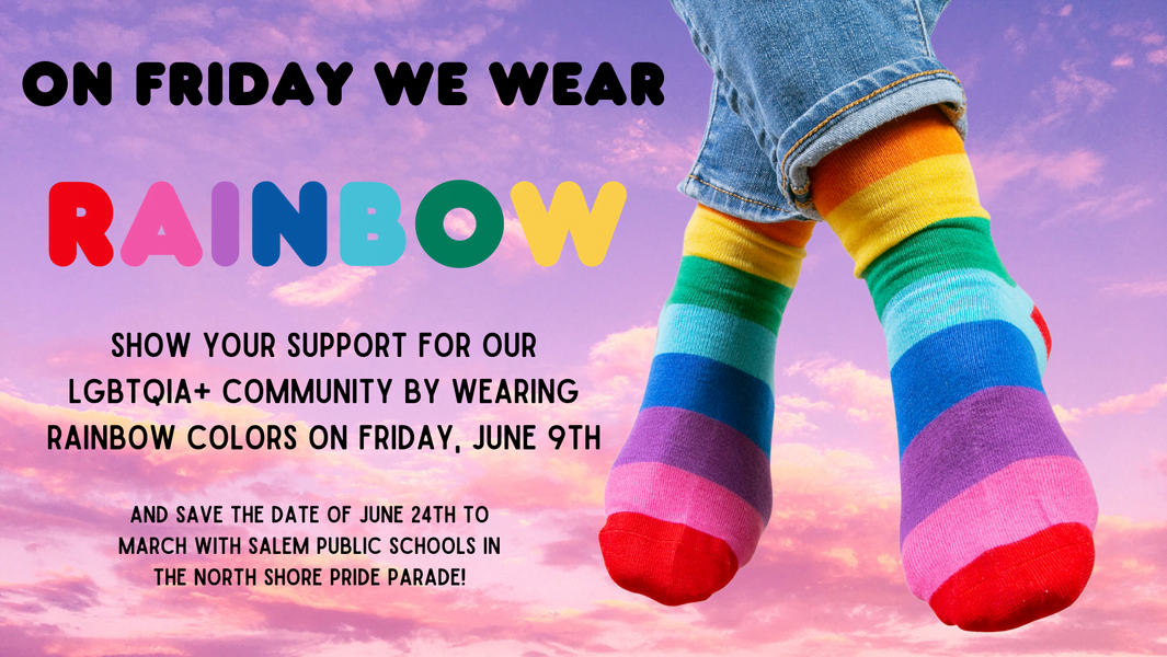 June marks the launch of Pride month across Salem and the Salem Public Schools. We are proud to celebrate our LGBTQ+ students, caregivers and staff throughout the month. The pride flag has been raised at each school and schools/classrooms will be facilitating events and discussions to highlight the importance of affirming the community. Additionally, next Friday, June 9th we will be asking all members of the SPS family to wear pride colors as a show of solidarity and allyship. Thank you in advance for your support!