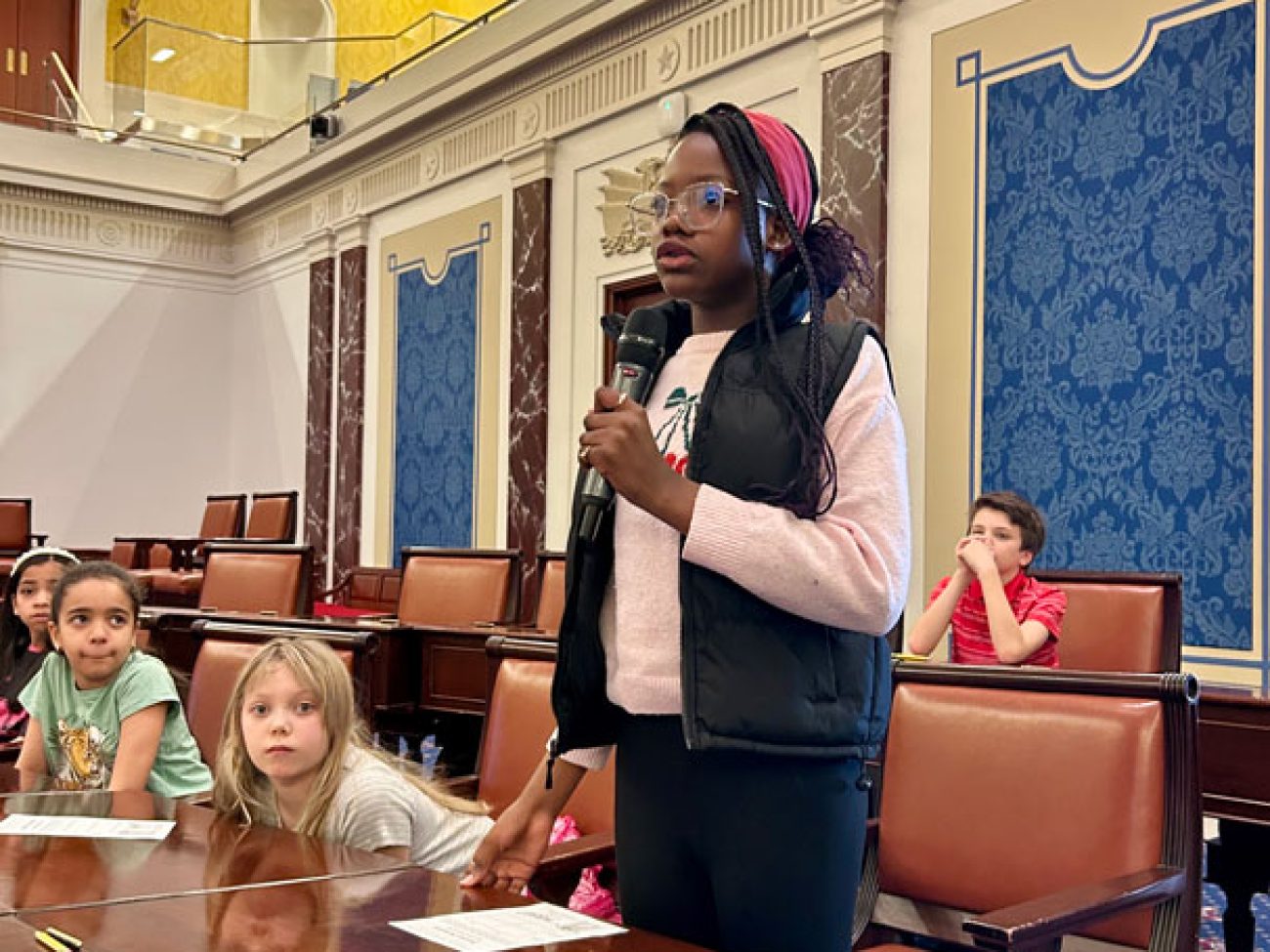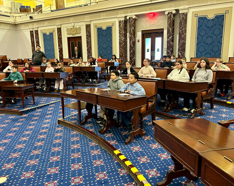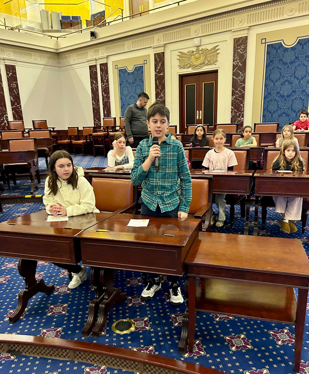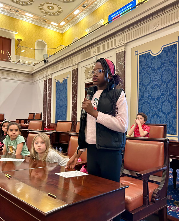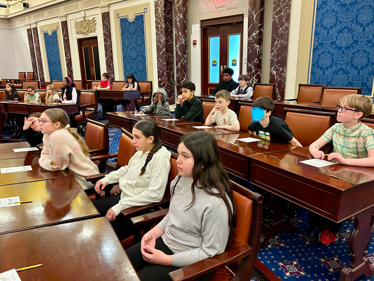 In lock step with the District’s core principle of elevating learning, the WHES Student government – twenty-five scholars in grades 4 and 5, accompanied by digital literacy educator Michael Collins – visited the Institute on Mar. 20 to experience ‘Senator for a Day,’ at which students practiced the process of passing a law.